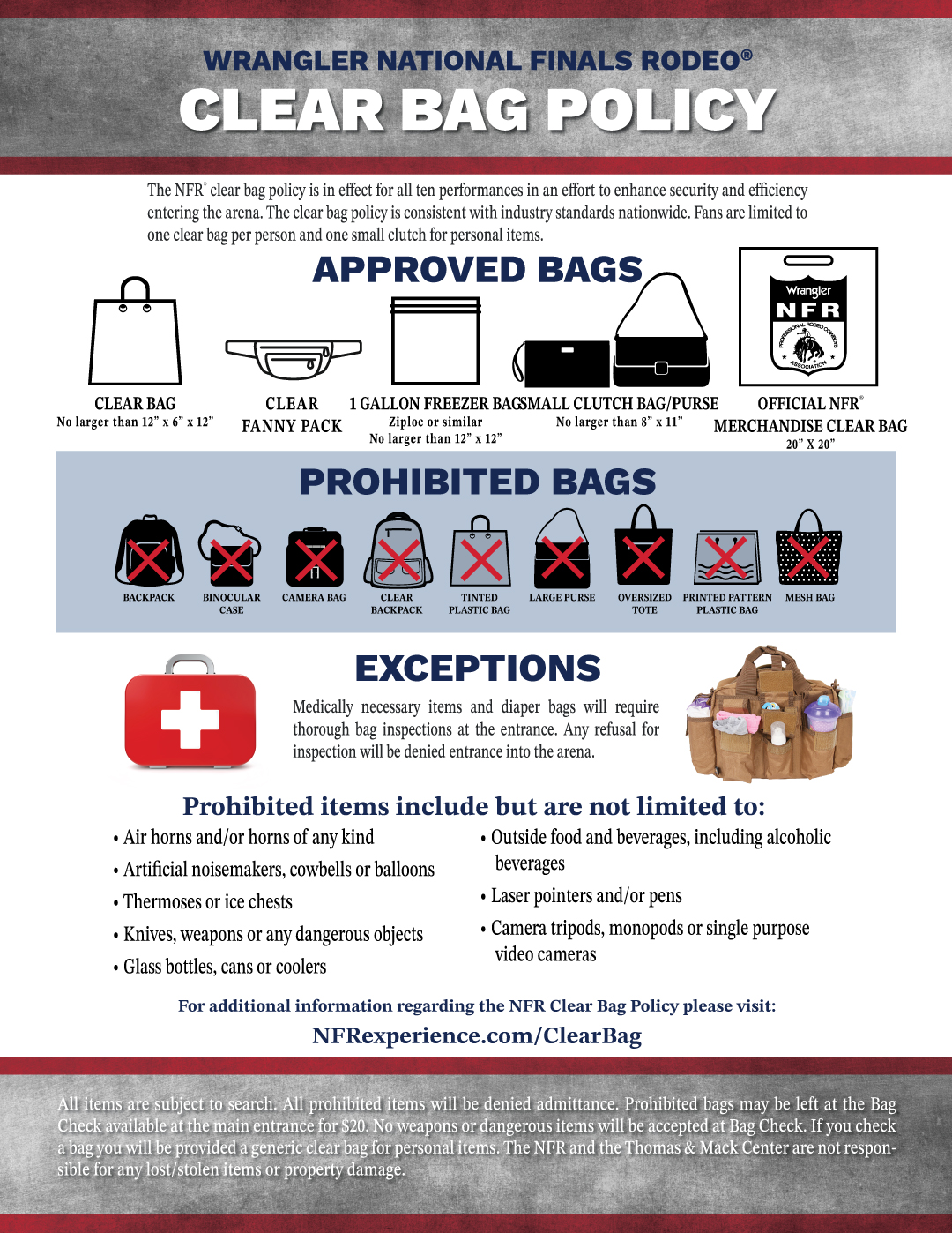 It should be noted that the Thomas & Mack Center, LVE and PRCA are unable to guarantee that complete exposure to any infectious illness will be eliminated. It is the responsibility of the ticket holder and their guests to assess their health and make appropriate decisions to minimize the risk of exposure and spread of illness before attending the Wrangler NFR. If you feel ill, are experiencing any symptoms including, but not limited to, a fever, cough, sneezing, loss of taste or smell, have tested positive or come in close contact with someone who tested positive for COVID-19 or any other infectious disease in the last fourteen days, or any member of your immediate household has been directed by health care providers or the health department to self-isolate, it is the ticket holder's responsibility to not attend the Wrangler NFR.